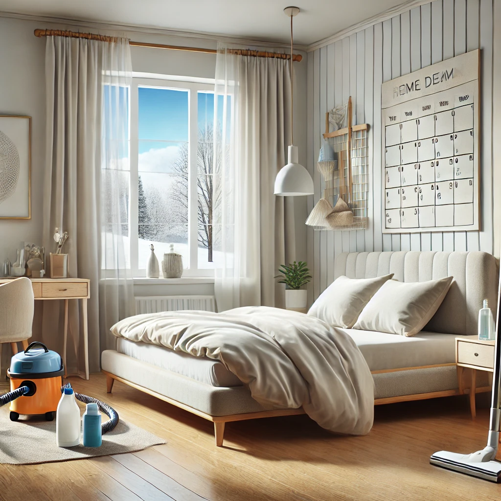• Winter: In the winter, focus on indoor tasks like cleaning and organizing storage spaces, washing windows, and deep cleaning carpets and rugs.